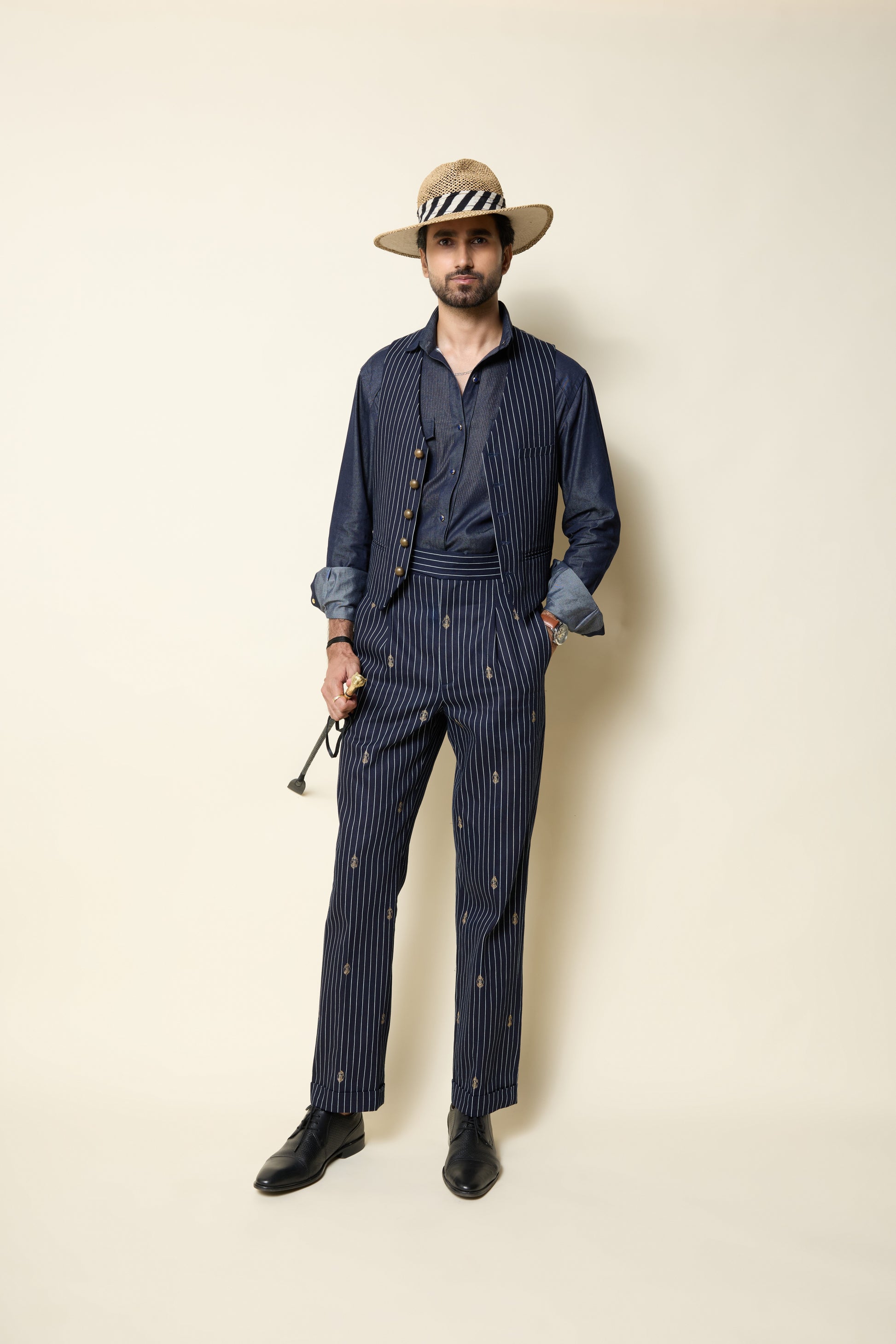 A modern take on heritage tailoring. These denim pinstripe trousers feature delicate gold crest embroidery, a structured waistband, and a sharp, straight leg cut — designed to stand out with quiet confidence.