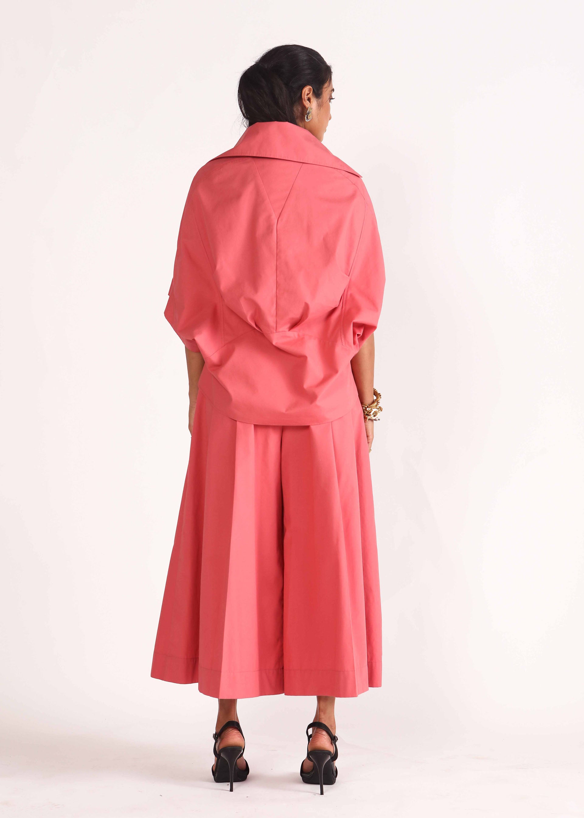 The Hridaya pants (Dark Coral) are paired with our Alef shirt (Dark Coral).