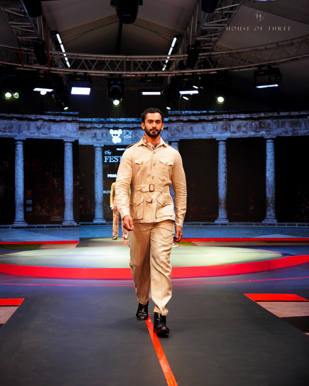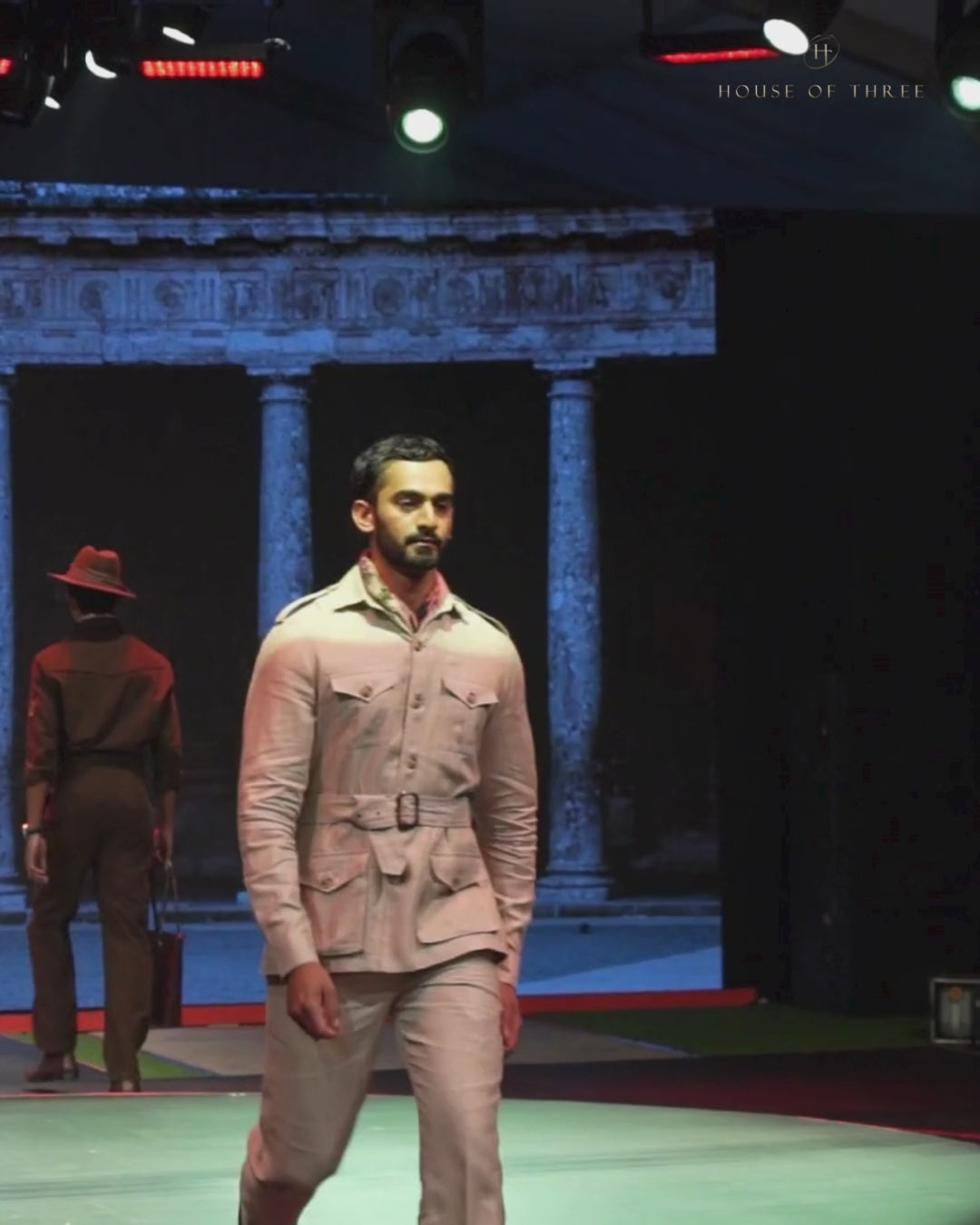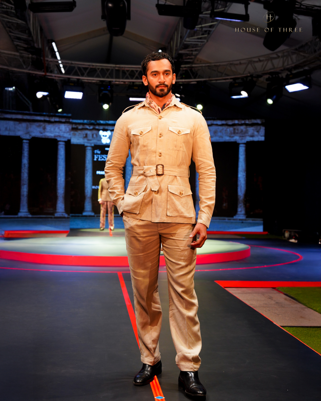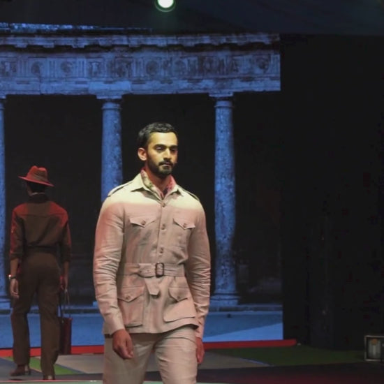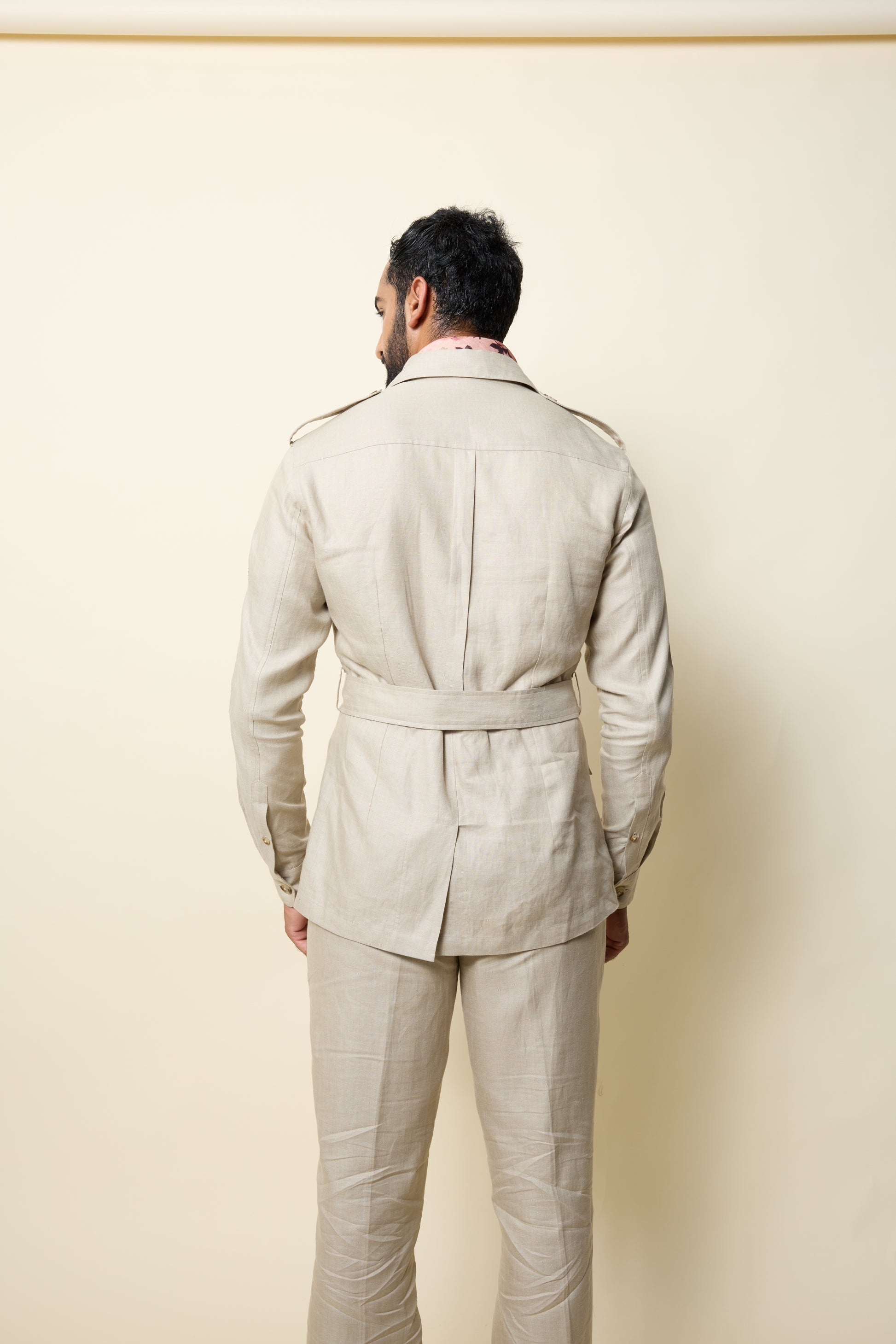 Linen Safari Shirt : A structured linen safari shirt featuring flap pockets, and an adjustable waist belt for a refined, utilitarian silhouette. Crafted in a soft sand-toned linen, it offers breathability, sharp tailoring, and effortless day-to-evening versatility.