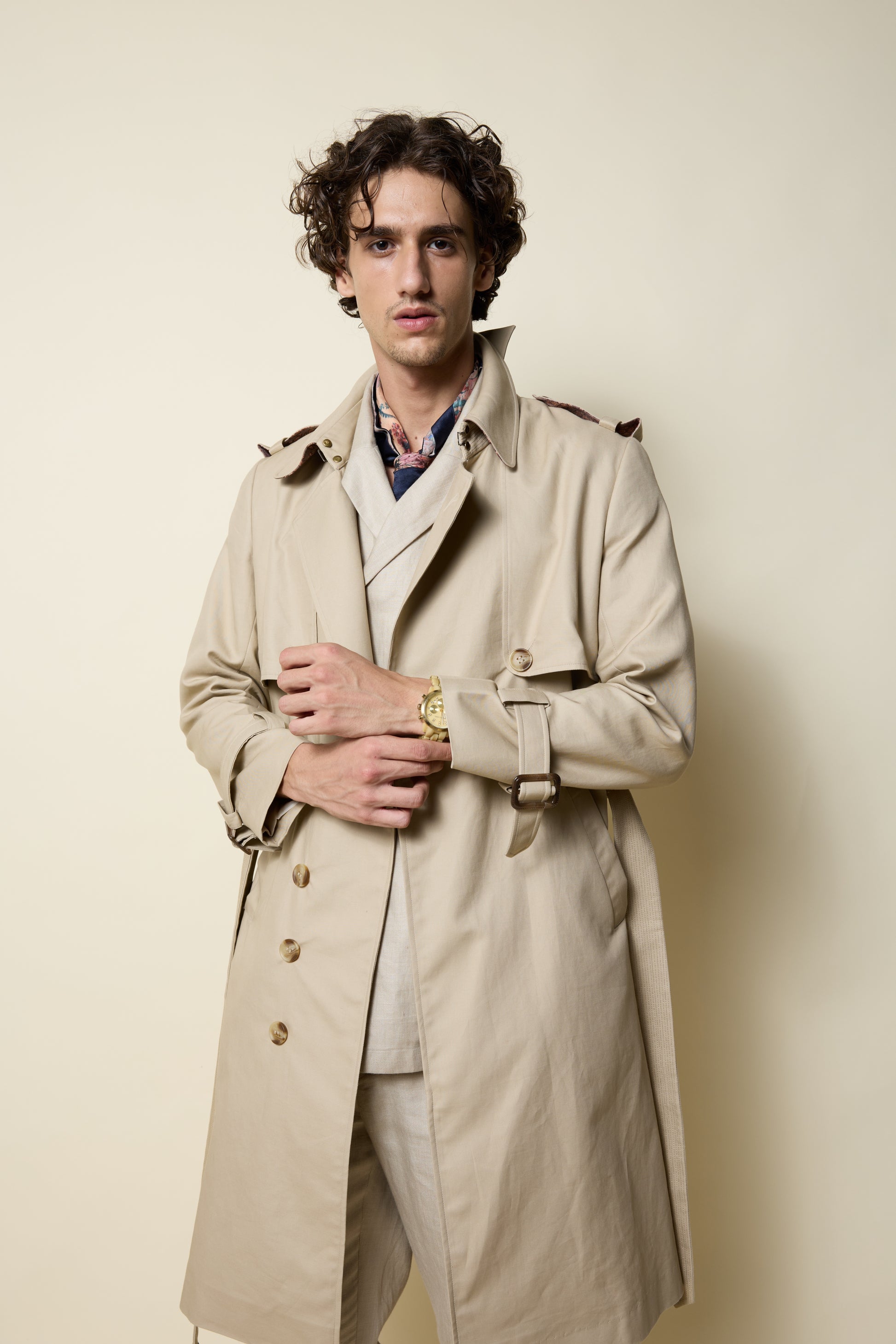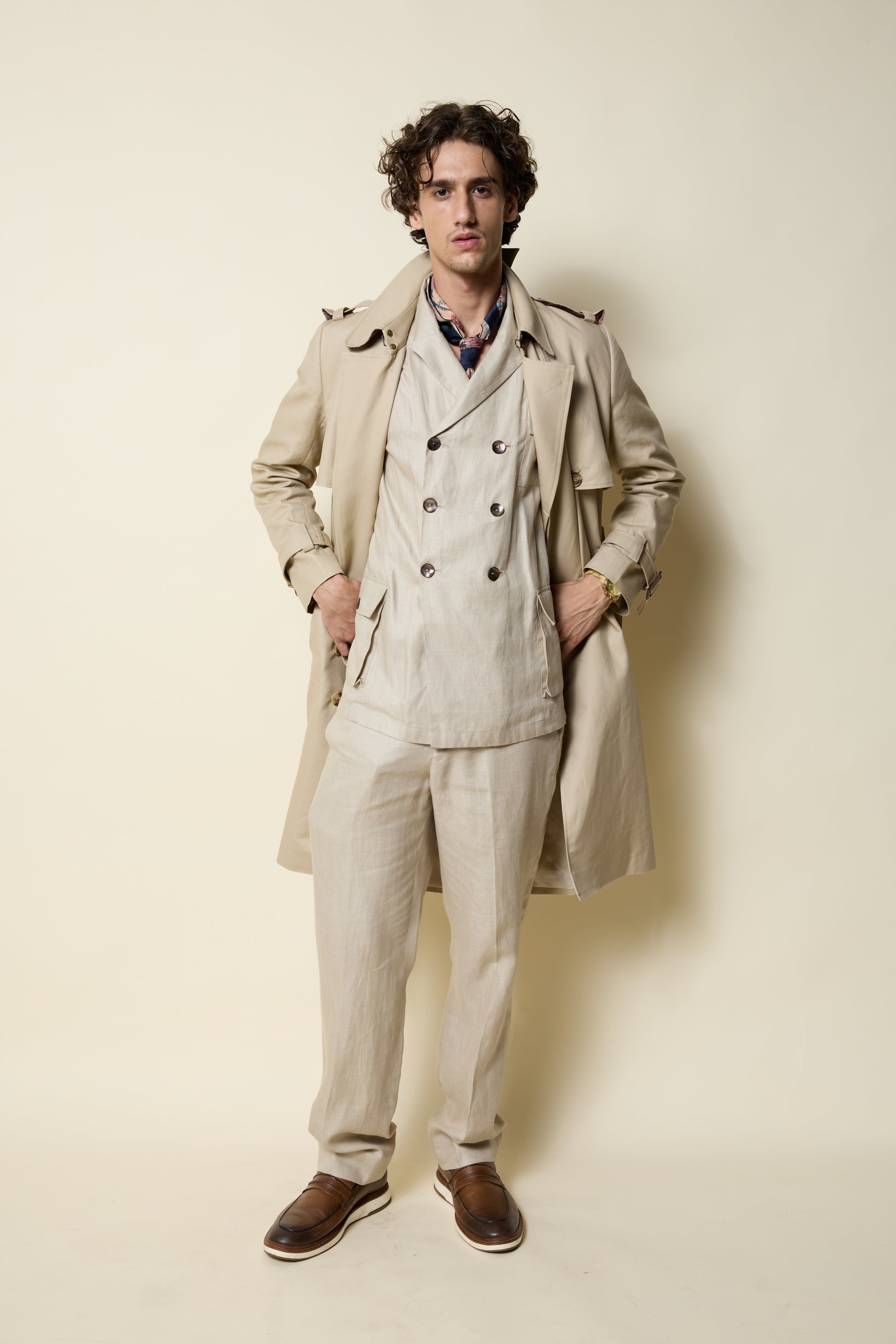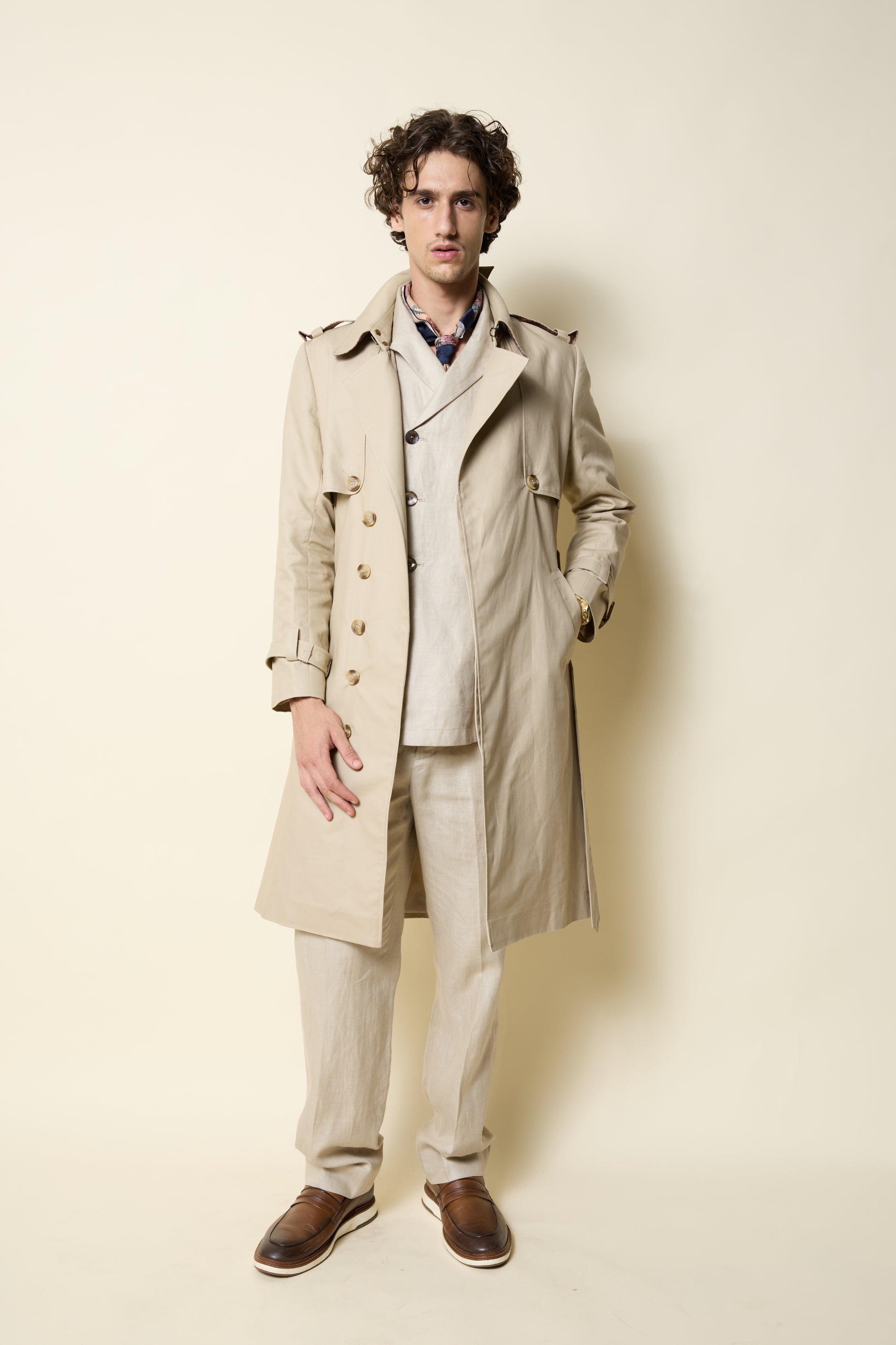 A linen trench in a soft sand tone, tailored with classic epaulettes and a fluid, easy drape. Its breathable structure brings relaxed sophistication to transitional dressing. Fully lined and structured