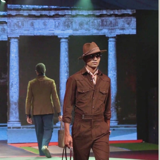 Gurkha Trousers : High-waisted corduroy Gurkha trousers with signature double-button closure and deep pleats for a sculpted fit. The straight, relaxed leg balances structure with effortless sophistication.