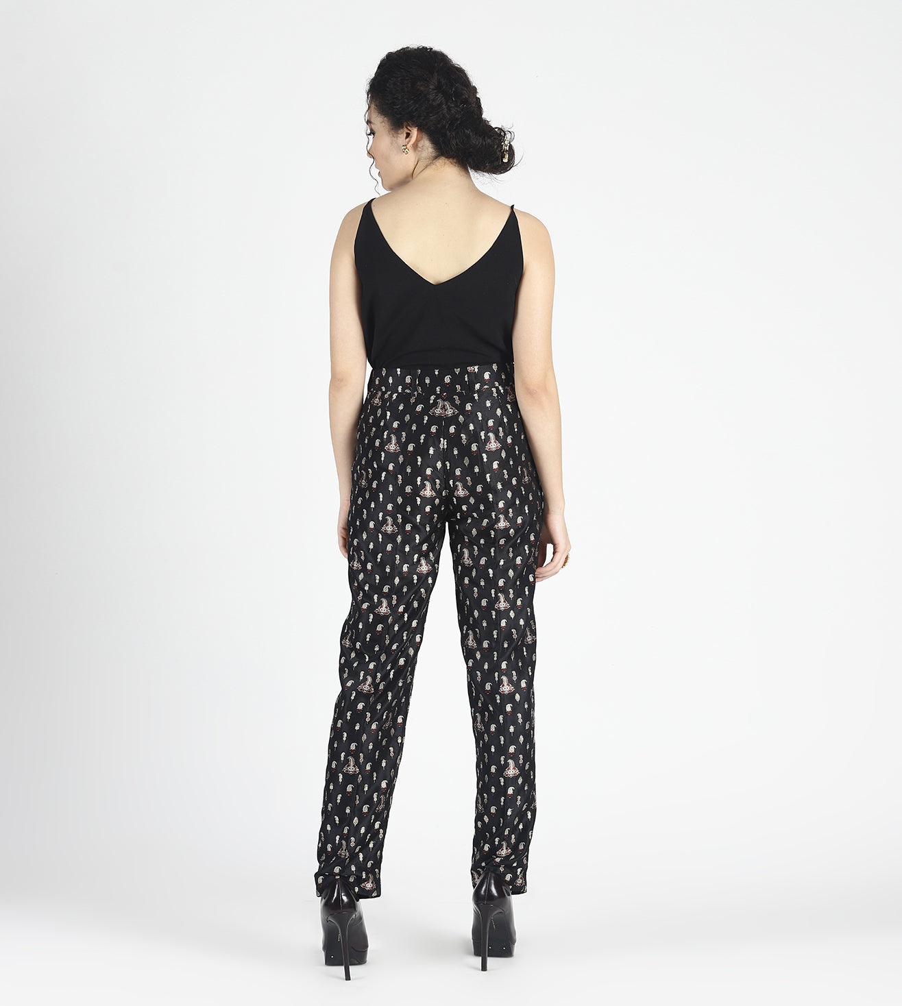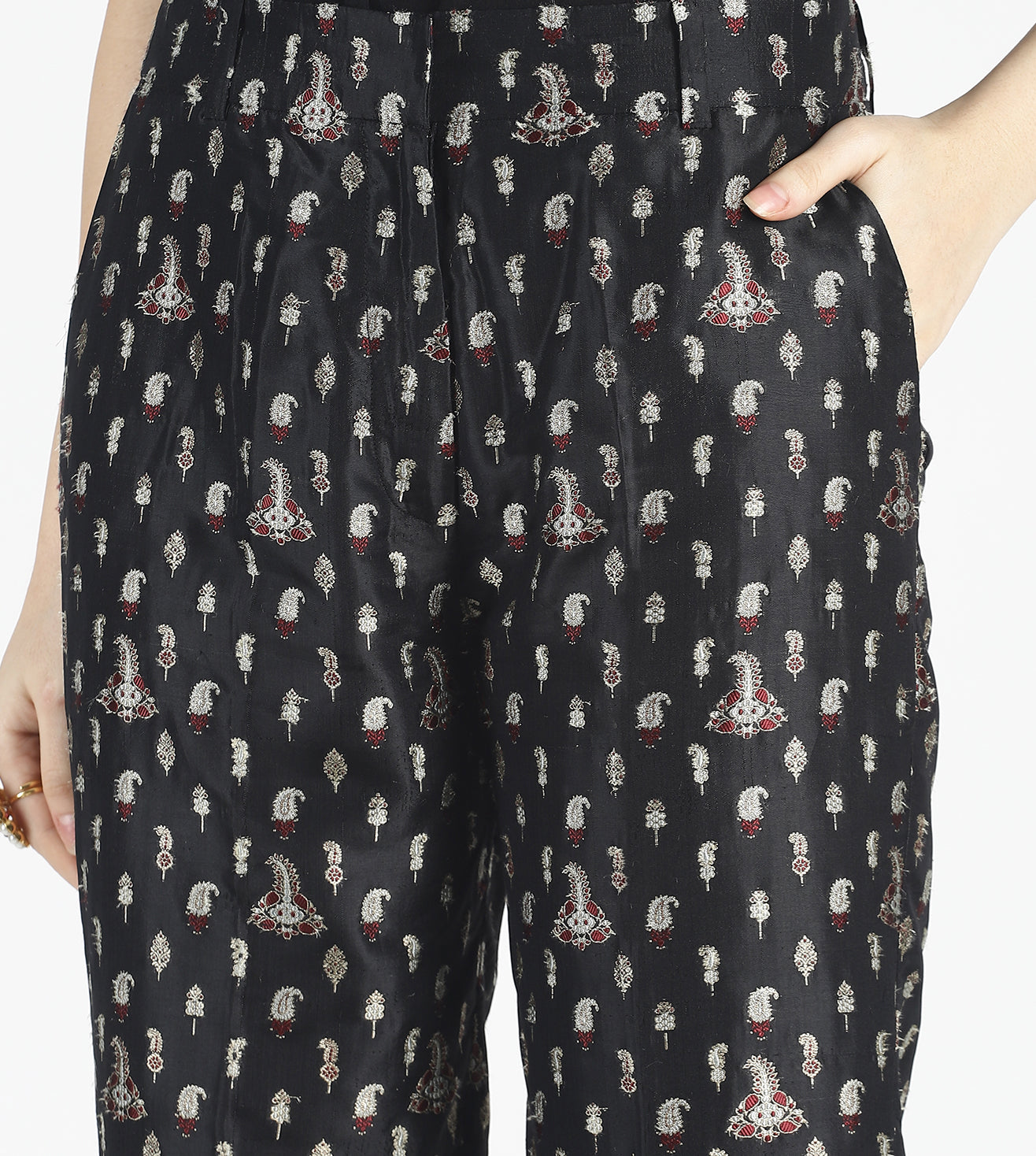 Jabeen trousers are cut in a floral jacquard handwoven benarasi silk . Wear it with a white tux shirt or a black camisole for a chic evening look or pair it with our Zohraa blazer to create the perfect cocktail suit.