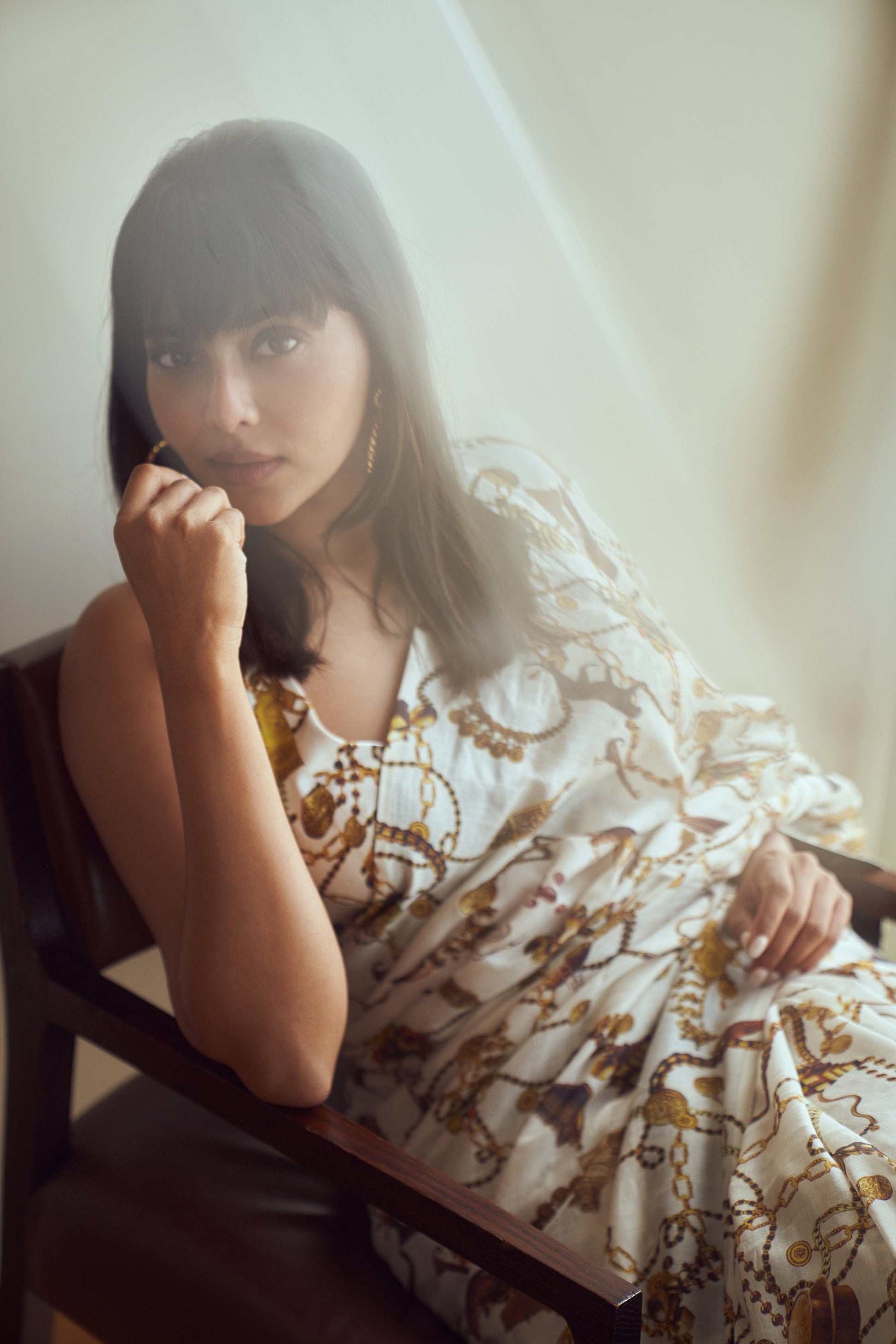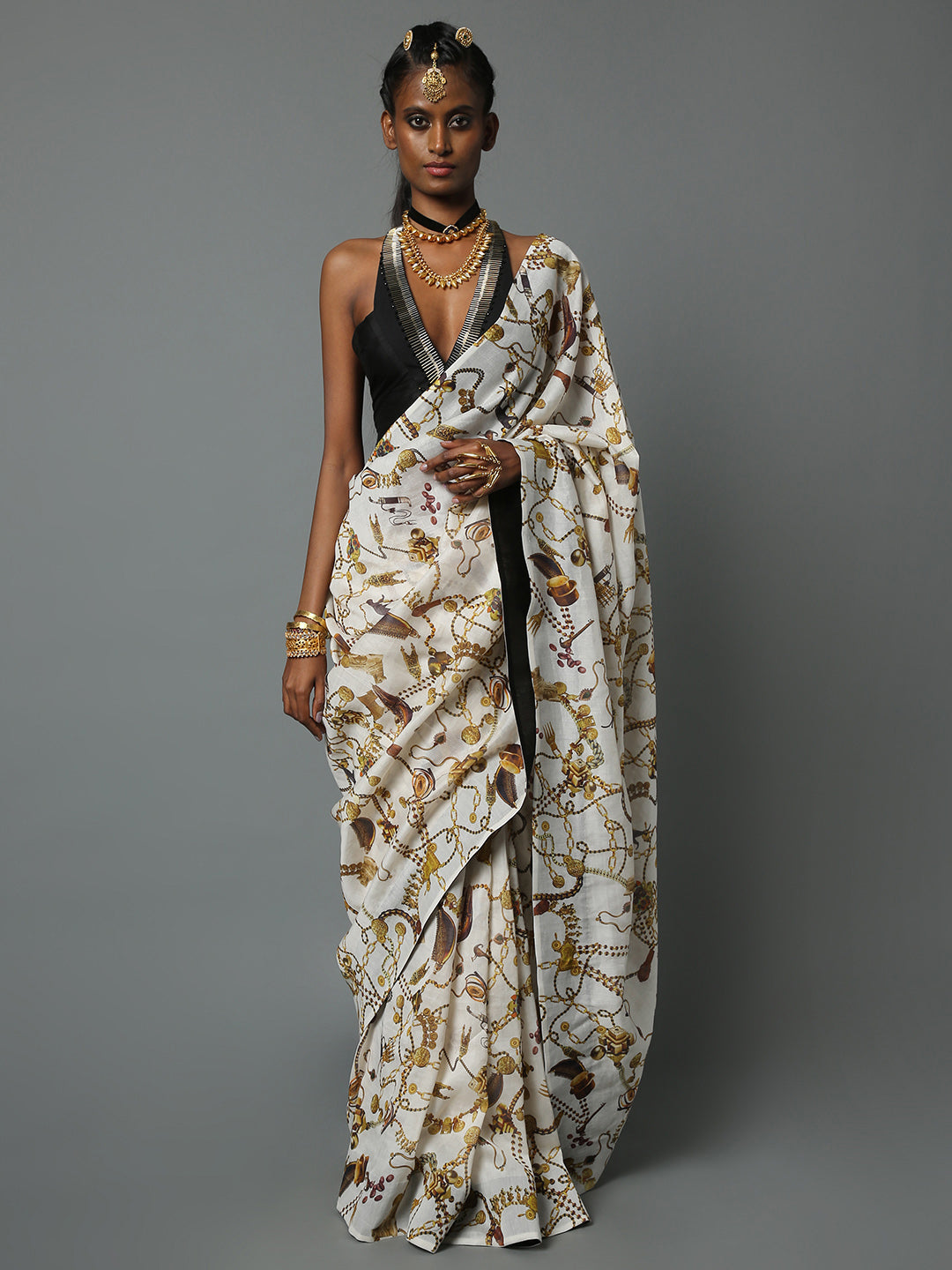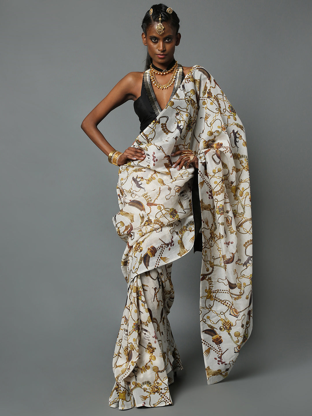 Thendral is our cotton silk chanderi sari printed in the Dravidian inspired jewel print. Thendral is finished with a hand hemmed black chanderi facing
