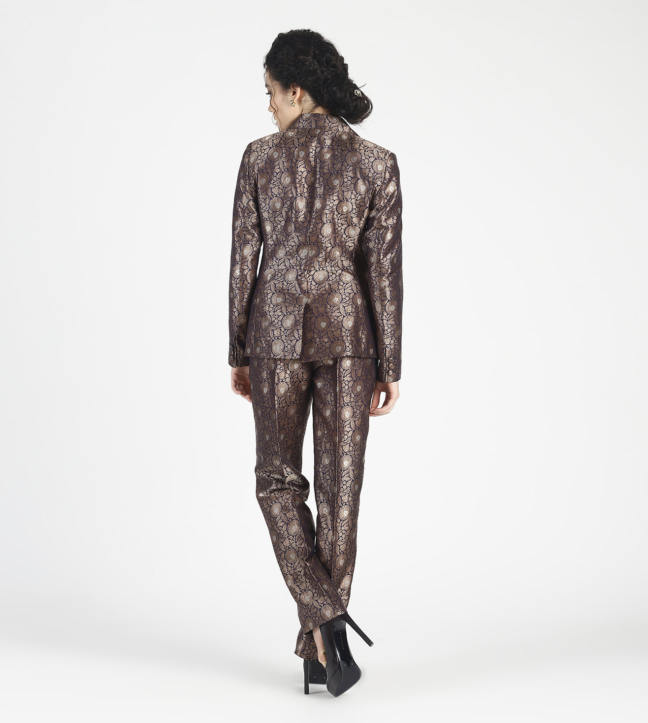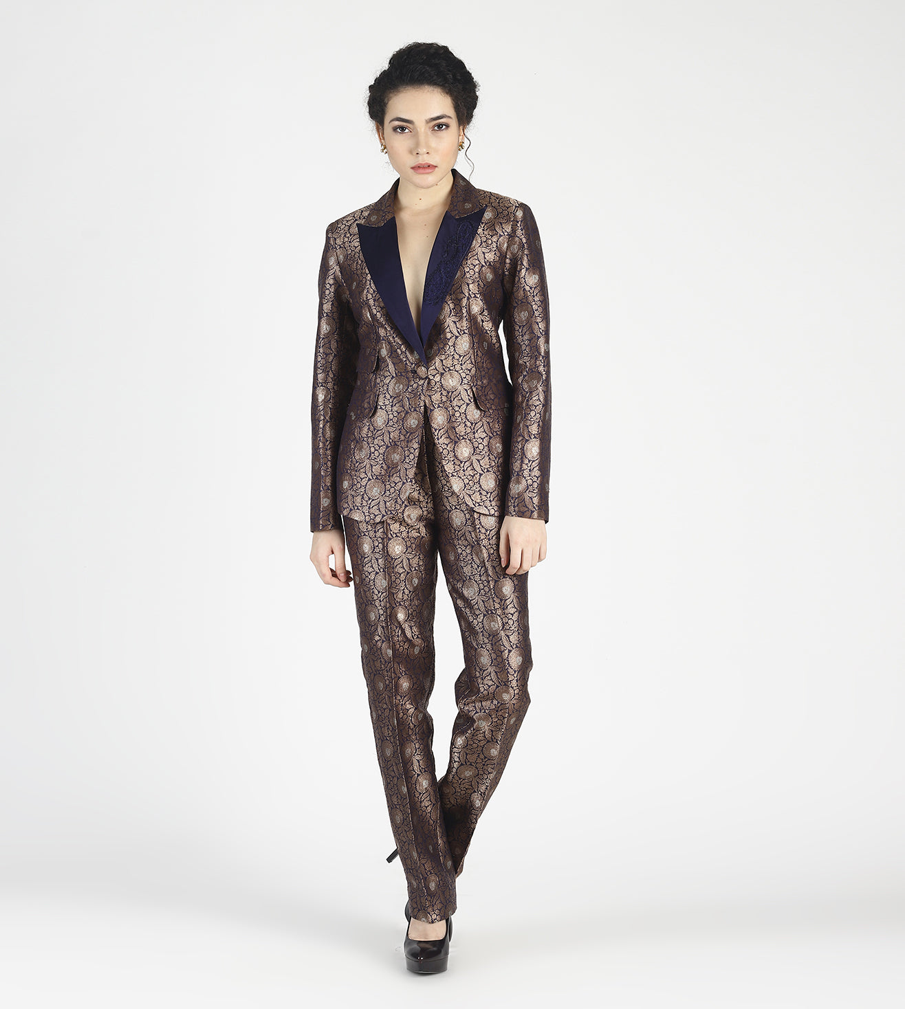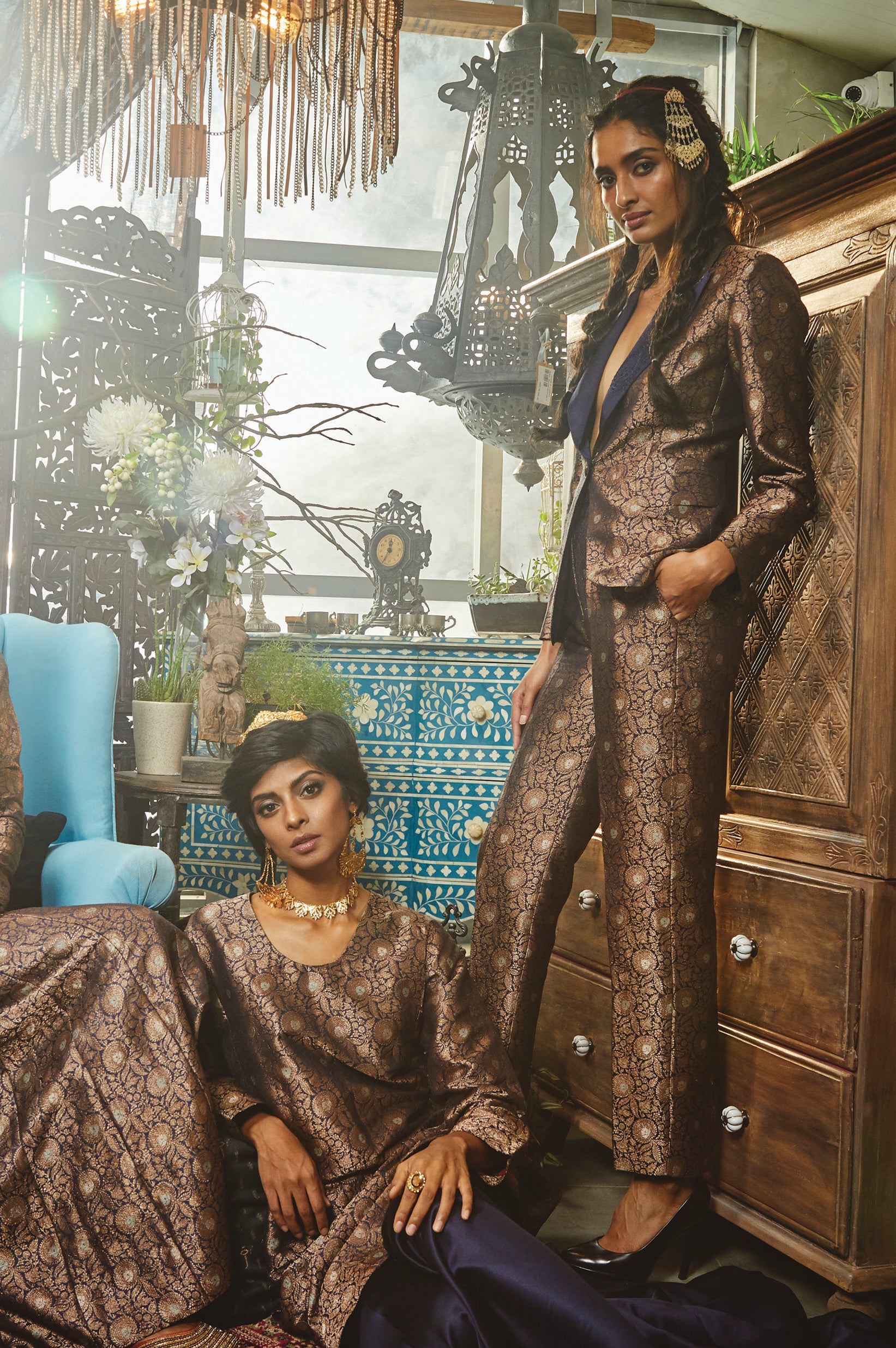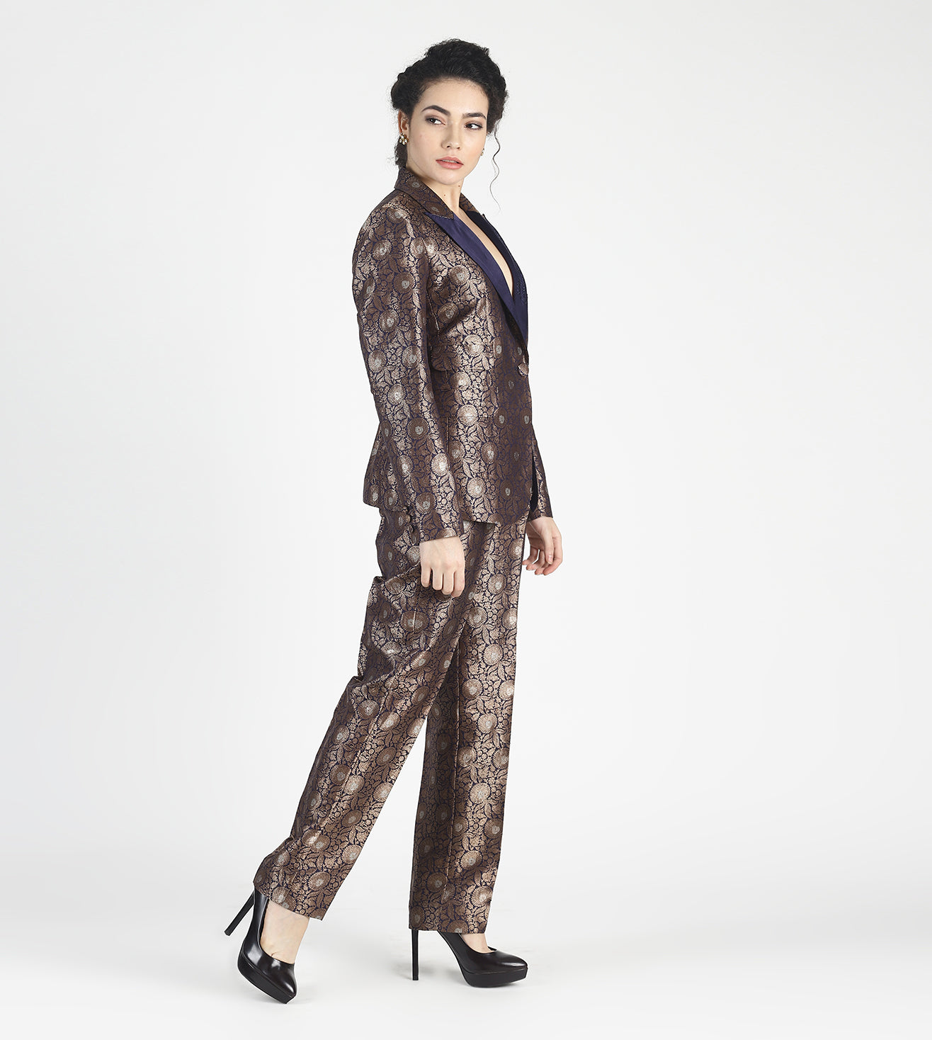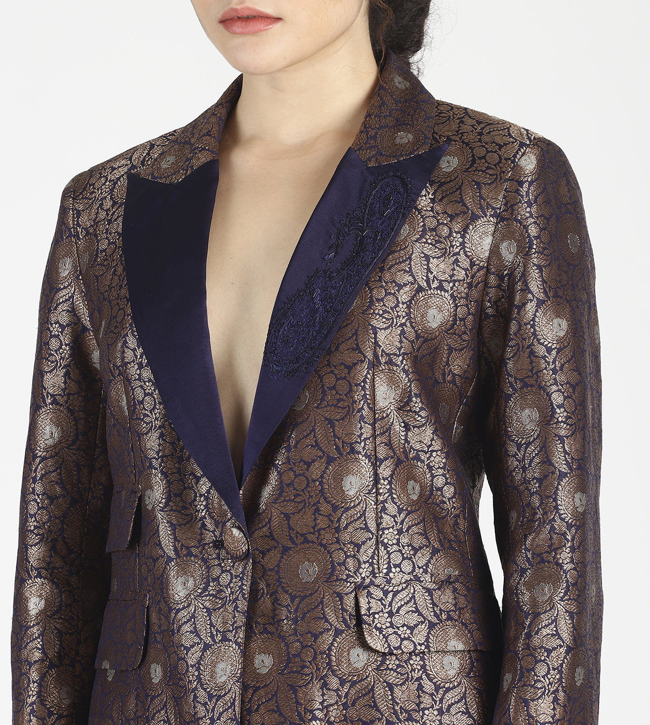 Zohraa is our glamorous floral jacquard blazer cut in handwoven benarsi silk . The egg plant silk lapel is embroidered in a tone on tone paisely used kashmriri ektaar threadwork and beads. Makes for the perfect festive cocktail look when worn with our Jabeen jacquard trousers.